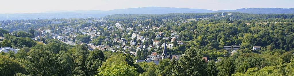 Herrlicher Fernblick Richtung Taunus schon vom EG. Ab dem OG ( ca. 4 m über Straßenniveau) oder von der Dachterrasse (8 m über der Straße) atemberaubender Blick auch auf die Stadt.