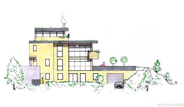 Beschreibung : Herrlicher Bauplatz mit genehmigter Planung für ein modernes, Einfamilienhaus, gemäß dem aktuellen Zeitgeschmack. Geradlinig - großflächig verglast - Dachterrasse mit Fernblick ...