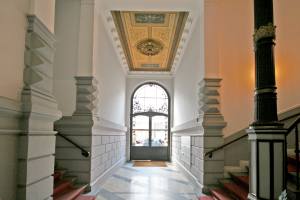 Die Holzfenster haben verspiegelte Isolierverglasung und innen Marmor-fensterbänke. Die Türen sind mit wertvollen Messingbeschlägen und teilweise mit aufwendiger Glasmalerei verziert. In den Büroräumen sind die Wand/Türbereiche teils mit verchromten Leisten und Spiegeln verkleidet. Überwiegend sind in den Räumen stilvolle Stuckdecken vorhanden.
