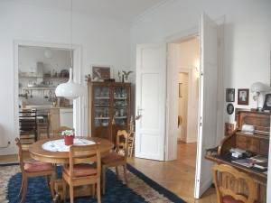 Zu den Ausstattungsdetails zählen u.a. die sehr schönen, nicht überladenen Stuckdecken, Kassettentüren und Dielen- bzw. Parkett-böden. Beide Bäder haben Tageslicht. Ein Schreiner hat maßgefertigt mehrere Einbauschänke eingepaßt, die viel Stauflächen bieten. Zusätzlich sind 2 Kellerräume vorhanden, in denen sich u.a. die eigene Heizungsanlage und der Waschmaschinenanschluß befinden. Als besonderes Highlight kann die wertvolle Siematic Einbauküche übernommen werden.