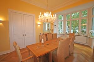 Alle 4 Zimmer sind einzeln vom Flur aus begehbar. Dennoch lassen sich die vorderen 3 Räume (ganz altbautypisch) durch Kassetten-Schiebetüren offen miteinander verbinden. Die Stilelemente wurden sehr schön herausgearbeitet und von den zahlreichen Farbschichten des Jahrhunderts befreit. Schöne Stuckdecken und Parkett- bzw. Pitchpine-Böden kamen zum Vorschein. Der offene Kamin sorgt für gemütliche Abende während der kalten Jahreszeit.