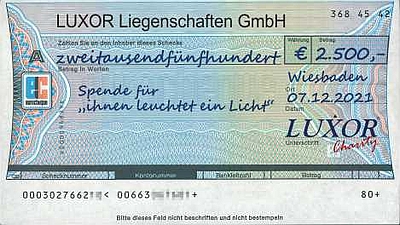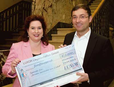 WIESBADEN (eva). 2012 war ein gutes Jahr für das Wiesbadener Immobilienunternehmen Luxor. „Da hatten wir die Idee, auch andere, denen es nicht so gut geht, an diesem Erfolg teilhaben zu lassen“, sagt Geschäftsführer Markus Herbig. Die „Luxor Charity“ war geboren: Zehn Prozent seines Honorars spendet das Unternehmen seit vergangenem Jahr an gemeinnützige Organisationen. „Wir haben schon in Äthiopien Brunnen gebaut, aber wir wollen auch hier vor Ort etwas Gutes tun“, so Herbig und überreichte im Pressehaus einen Scheck über 5.000 Euro an Eva Wodarz-Eichner von „ihnen leuchtet ein Licht“. Die Idee der „Luxor Charity“ hat sich schon herumgesprochen – die Kunden des Unternehmens können mit entscheiden, wohin die Spende gehen soll. Ob in Afrika Menschen mit Trinkwasser versorgt und in Deutschland Tafeln gedeckt werden – oder ob in Wiesbaden für manch einen Bedürftigen ein Licht zum Leuchten gebracht wird.